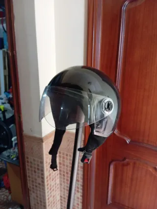Casco de moto negro con visera transparente. - Diseño abierto. - Correa de sujeción ajustable.