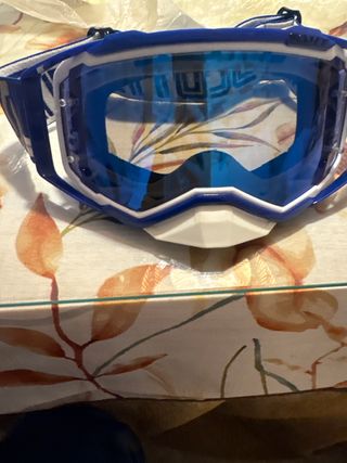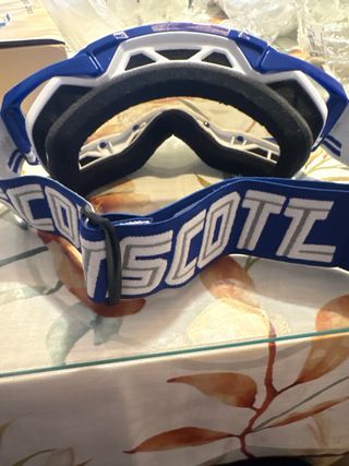 Gafas de protección Scott en color azul y blanco, ideales para motocross o enduro. Diseñadas para ofrecer una visión clara y protección. - Montura azul y blanca. - Lente con acabado espejo. - Correa ajustable con banda de silicona antideslizante.