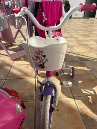 Bicicleta infantil de tres ruedas con diseño de Minnie Mouse. - Color rosa con detalles en morado. - Asiento con lunares blancos. - Cesta delantera blanca.