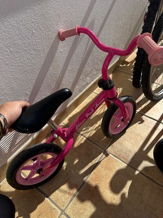 Bicicleta de aprendizaje color rosa. - Marco de metal. - Puños rosas. - Ruedas negras.