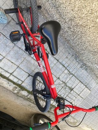Bicicleta BMX de color rojo, lista para rodar. - Manillar rojo. - Puños verdes. - Rueda delantera negra.
