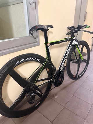 Bicicleta de carretera Cannondale SystemSix de carbono.cuadro tope de gama de alto módulo , grupo Durace de 11 v con bielas sl2 con potencio metro en las dos piernas y plato carbón ti , manillar integrado y aparte regalo el original knot , no incluyó pedales ruedas knot de 64 cubierta , talla 47