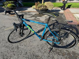 Bicicleta Fuji Jari 1.7, ideal para gravel y cicloturismo. Su color azul le da un estilo único. - Cuadro de aluminio. - horquilla carbono - Frenos de disco. - Cambio shimano tiagra 2x10 - Portabultos trasero tubus muy ligero - Guardabarros sks - Pata de cabra