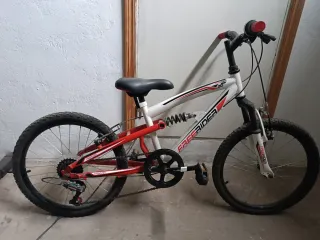 Bicicleta infantil de la marca Freerider, modelo 20. Funciona todo correctamente. - Color blanco con detalles en rojo y negro. - Ruedas de 20 pulgadas. - Suspensión delantera y trasera.