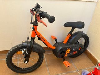 Bicicleta infantil de la marca Btwin, ideal para los más pequeños. - Color naranja vibrante. - Diseño divertido con motivos de robot. - Ruedas de 12 pulgadas.
