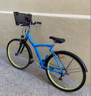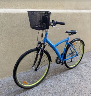 Bicicleta de adulto de la marca Decathlon, ideal para paseos. - Cuadro de color azul claro. - Portabultos trasero. - Ruedas de 28 pulgadas. - Suspensión delantera.