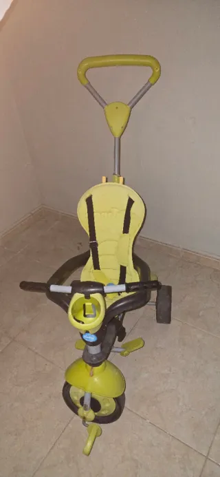 Triciclo de color verde y negro, diseñado para los más pequeños. - Asiento ergonómico con arnés de seguridad. - Manillar para control parental. - Reposapiés para mayor comodidad.