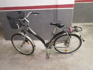 Bicicleta familiar de la marca Btwin en color negro. Ideal para paseos y desplazamientos diarios. - Cuadro robusto. - Ruedas de buen tamaño. - Sillín cómodo. - Portabultos trasero.