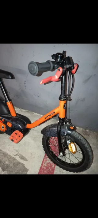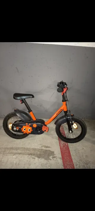 Bicicleta infantil Btwin de color naranja, ideal para los más pequeños. - Ruedas de 16 pulgadas. - Frenos delanteros y traseros. - Sillín ajustable. - Pedales antideslizantes.