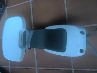 Silla para bicicleta de color blanco y gris, diseñada para niños. - Cinturón de seguridad de 5 puntos. - Reposapiés ajustables. - Diseño ergonómico.