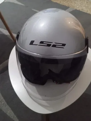Casco de moto plateado con visera. - Marca LS2. - Visera transparente. Talla s