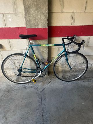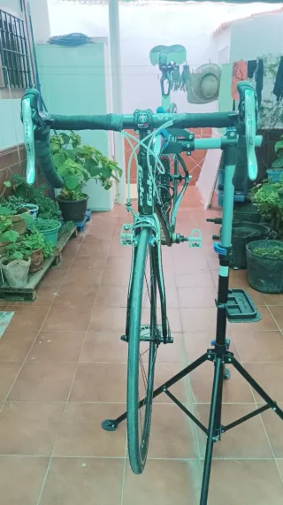 Bicicleta de carretera Suntrack en buen estado, lista para rodar. - Cuadro de color verde azulado. - Manillar de carretera con cinta negra. - Sillín negro. - Portabidón negro y morado. - Cuentakilometros.