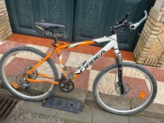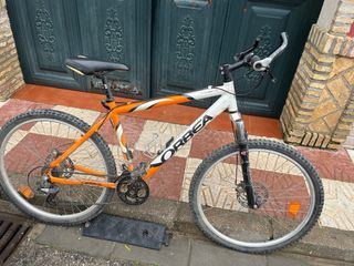 Bicicleta Orbea Touareg de montaña en color naranja y blanco. Ideal para disfrutar del ciclismo. - Cuadro de aluminio. - Frenos de disco. - Suspensión delantera. - Cambio Shimano de 7 velocidades y 3 platos - Ruedas de 26 pulgadas