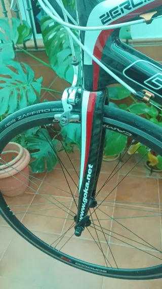 Bicicleta de carretera con cuadro de carbono. - Cuadro de carbono. - Ruedas Vittoria Zaffiro. - Llanta Campagnolo Scirocco.