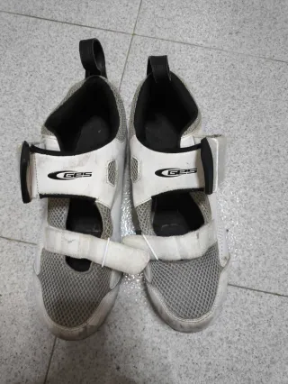 Zapatillas especiales para la modalidad de triatlón, también se pueden usar para ciclismo, son compatibles para calas de montaña y carretera. Talla 43 de la marca Ges, color blanco con detalles rojos y negros. Usadas menos de un año, algún pequeño defecto estético pero totalmente funcionales. Cualquier duda preguntar. #triathlon #ciclismo #carrera #natación #cicling #bike #biker #shoes
