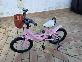 Bicicleta infantil B'Twin en color rosa y negro, con cesta. En muy buen estado porque casi no se ha usado - Cuadro de acero. - Ruedas de 24 pulgadas. - Frenos V-Brake. - Guardabarros delantero y trasero. - Sillín ajustable.
