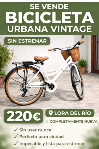 Bicicleta urbana de estilo vintage, color blanco y sin usar. Ideal para paseos por la ciudad. - Cesta delantera de mimbre. - Sillín y puños marrones. - Portabultos trasero. - Ruedas con aro color miel.