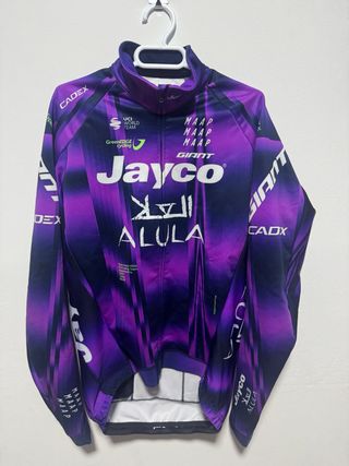 Exclusiva Chaqueta de ciclismo Jayco Alula con diseño llamativo. Artículo fabricado exclusivamente para corredores del equipo No disponible al público - Talla L - Mangas largas - Cierre completo frontal - Tejido técnico transpirable y paravientos rapha assos specialized sworks orbea cannondale trek castelli santini giant bianchi shimano sram oakley gobik gabba sportful giordana etxeondo sidi poc kask giro bianchi nalini lotto jumbo deceuninck alpecin kalas movistar euskaltel met UAE pogacar giro abus met ciclismo alpecin canyon remco sram shimano red bull