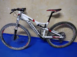 Bicicleta de montaña Cannondale Scalpel con suspensión delantera Lefty y trasera. - Cuadro de aluminio blanco con detalles rojos y negros. - Ruedas de 29 pulgadas. - Frenos de disco. - Transmisión Shimano.