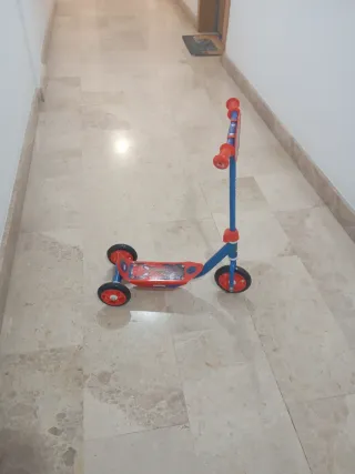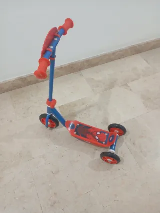 Patinete de tres ruedas con diseño divertido. - Estructura de color azul y rojo. - Plataforma con diseño de Spiderman.