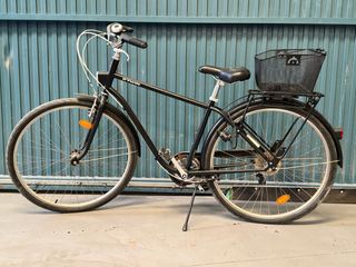Bicicleta urbana Btwin Elops en color negro. Ideal para desplazamientos diarios. - Cuadro de acero. - Ruedas de 28 pulgadas. - Frenos V-brake. - Portabultos trasero. - Cesta.