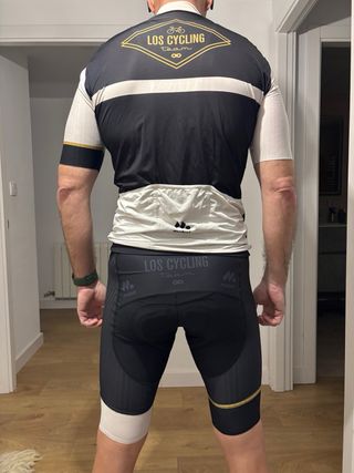Conjunto de ciclismo Mobel con diseño moderno. - Maillot de manga corta en negro, blanco y detalles dorados. - Culotte negro con tirantes y detalles en la pierna.