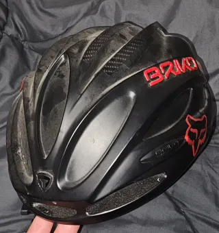 Casco de ciclismo de montaña en color negro. Presenta un diseño aerodinámico y detalles de marca. - Logo de la marca BRKO en rojo. - Adhesivo del logo Fox en rojo. - Diseño con ventilaciones. - Escudo de la marca en la parte frontal.