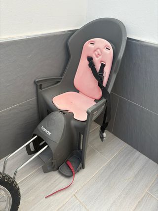 Sillita para montar al niño en la bicicleta de la marca Hamax. Es de color gris con cojín rosa. - Cojín acolchado. - Cinturón de seguridad. - Reposapiés. El cojin esta un poco descolorido del sol. Pero todo lo demás esta estupendo