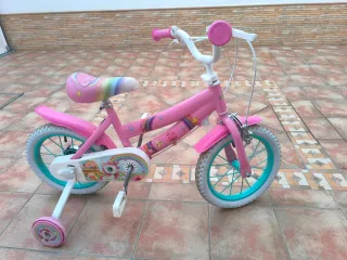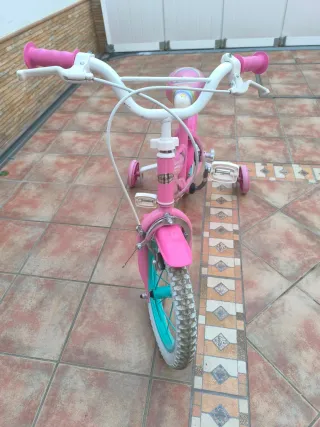 Bicicleta infantil de color rosa, ideal para los primeros paseos. - Ruedines incluidos para mayor estabilidad. - Diseño divertido con detalles de unicornios y arcoíris. - Ruedas blancas con llantas turquesa. SOLO VENTA EN PERSONA, NO SE HACEN ENVÍOS