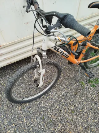 Bicicleta de montaña con ruedas de 24 pulgadas. Ideal para iniciarse en el ciclismo. - Cuadro de doble suspensión. - Color naranja y blanco. - Ruedas todoterreno.