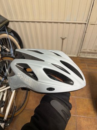 Casco de ciclismo de la marca SPIUK en color blanco. Diseñado para ofrecer comodidad y protección. - Diseño aerodinámico con múltiples ventilaciones. - Sistema de ajuste para una mayor seguridad. - Logotipo de la marca visible en la parte frontal.