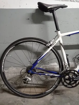 Bicicleta de carretera Btwin en magnífico estado. Ideal para principiantes. Grupo completo Shimano 105. Excepto cambio trasero que es Ultegra de 10 velocidades. Se entrega con pedales automáticos Look - Cuadro de carbono. - Llantas de aluminio con neumáticos en buen estado. - Muy cuidada.