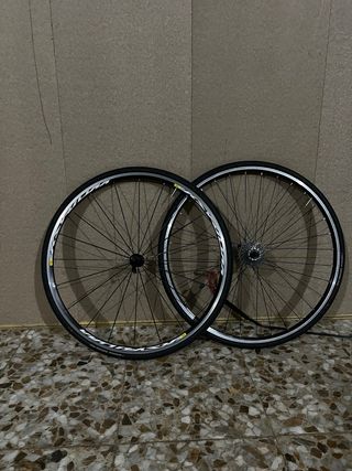 Juego de llantas Mavic y gurpil para bicicleta de carretera. Listas para rodar. cámaras nuevas y cubierta delantera nueva y trasera con poco uso. se recarga sensor de velocidad y cadencia carmín - Llantas de aluminio. - Incluye cassette shimano 105 10v.