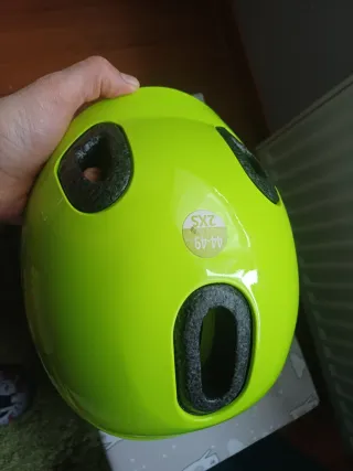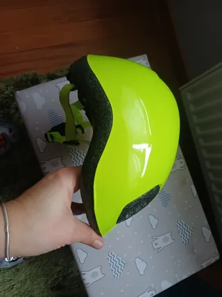 Casco de protección para niños, talla XS, de la marca Decathlon. Ideal para actividades deportivas. - Color verde lima brillante. - Sistema de ajuste con correas. - Poco uso, pongo buen estado porque tiene una marca en el plástico de un lateral, como se ve en la última foto.