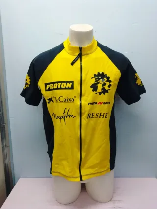 Maillot de ciclismo profesional con diseño llamativo en amarillo y negro. Xxxl 62cts - Marca: PROTON - Patrocinadores: la Caixa, RESHE, PATA NEGRA - Componentes: Shimano - Logo de equipo en el pecho