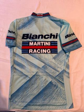 Maillot de ciclismo retro de la marca Bianchi con diseño Martini Racing. Talla L. - Diseño icónico de Bianchi y Martini. - Logos de Santini, Shimano y Rock Shox. - Estilo vintage para coleccionistas.