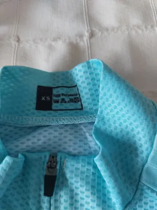 Maillot de ciclismo Bianchi en talla L. Diseño moderno en color celeste con detalles en negro. - Cremallera frontal completa. - Mangas cortas. - Tejido transpirable.