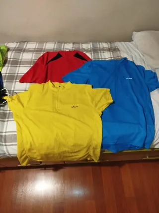 Lote de tres maillots de ciclismo en talla XL. Incluye un maillot rojo, uno azul y uno amarillo.