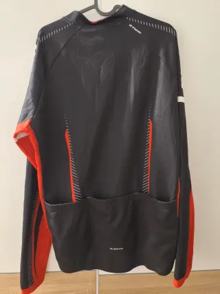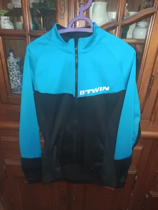 Chaquetilla/maillot Btwin Aerofit de manga larga. Queda bastante ceñida. - Color negro. - 3 bolsillos traseros. - Bolsillo con cremallera repelente al agua - Detalles reflectantes tanto delante como detrás. - Cremallera frontal. Está usada pero en un estado como para aguantar todavía mucho tiempo. Vendo porque subí de talla.