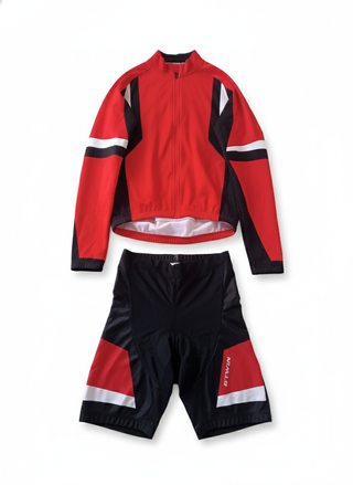 Conjunto de ciclismo para hombre de la marca B'Twin, ideal para tus rutas. - Maillot de manga larga en color rojo y negro. - Culotte corto negro. - Incluye un par de guantes de ciclismo negros sin dedos.
