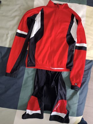 Conjunto de ropa de ciclismo que incluye maillot y culotte talla XXL (apropiado para quién tenga xl porque no da talla). - Maillot de manga corta con diseño a rayas rojas y azules. - Culotte azul con tirantes blancos y detalles en rojo y blanco. - Maillot btwin rojo-azul talla XL - Precio 10€/unidad