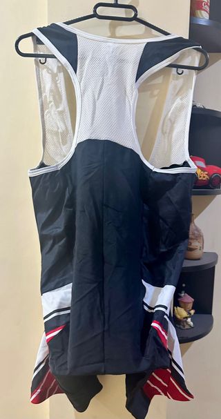 Conjunto de maillot y culote de ciclismo de la marca Btwin. - Maillot de manga corta con cremallera frontal. - Culote con tirantes. - Diseño en blanco, negro y rojo Talla M