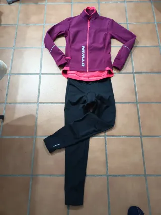 Conjunto de ropa deportiva B'TWIN para mujer. - Chaqueta de color rosa oscuro con cremallera. - Maillot de color rosa brillante. - Pantalón largo negro. -Talla M