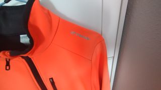 Maillot de ciclismo Btwin en color naranja. Cremallera frontal completa. Bolsillo con cremallera en el pecho. Pequñas manchas de roce de cadena en una manga (se adjunta foto).