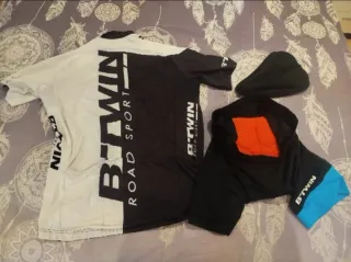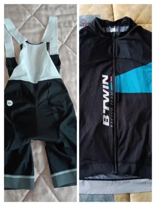 Conjunto de ciclismo compuesto por maillot y culotte. - Maillot azul con detalles en negro y amarillo neón. - Culotte negro con tirantes blancos y detalles en azul y blanco. - Marca Btwin visible en el culotte.5 euros cada uno.