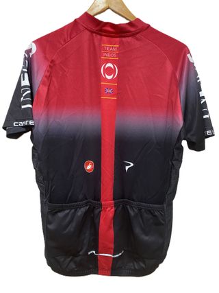 Maillot de ciclismo con diseño degradado de rojo a negro. - Logo de INEOS en el pecho. - Logo de Pinarello en la manga. - Logo de Castelli. - Detalle UCI World Tour. - Talla XXL. - Imagen creada con IA.