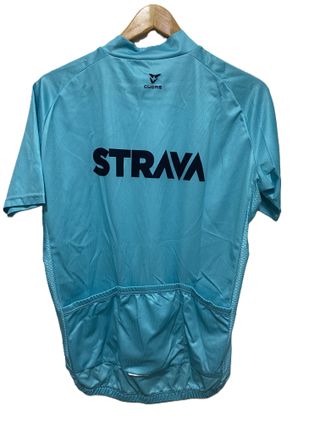 Maillot de ciclismo de manga corta en color azul. - Logo de Strava en grande en la espalda. - Pequeño logo de Cuore en la nuca. - Tres bolsillos traseros. - Banda reflectante en la parte inferior de la espalda. - Talla XXL. - Imagen creada con IA.