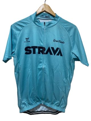 Maillot de ciclismo de manga corta en color azul. - Diseño con logo de Strava y Gran Fondo. - Cremallera frontal completa. - Tejido ligero y transpirable. - Talla XL. - Imagen creada con IA.
