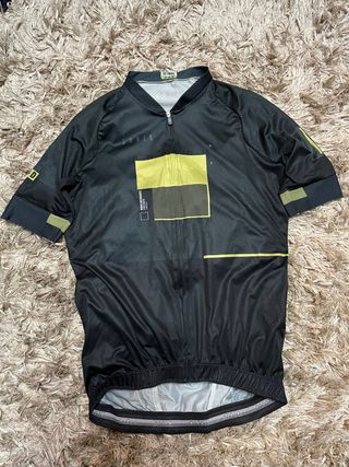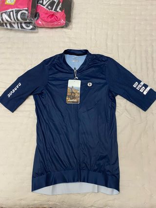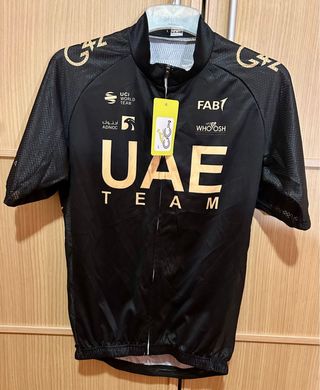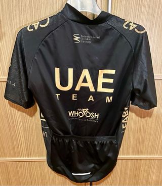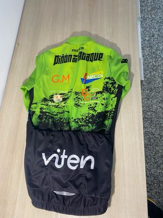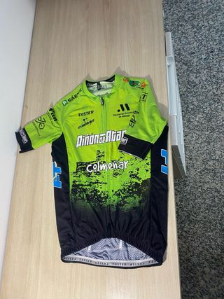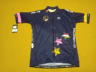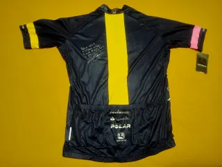 Maillot de ciclismo. -Talla L, nuevo sin etiquetas. - Color negro con detalles dorados. - Diseño con logos del equipo y patrocinadores. - Tejido transpirable.