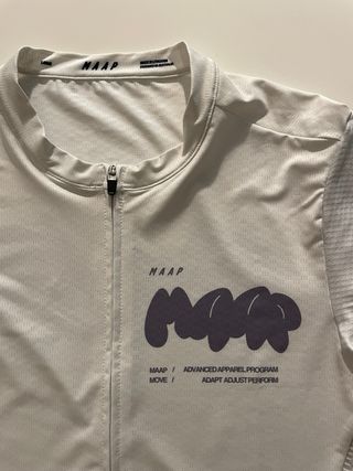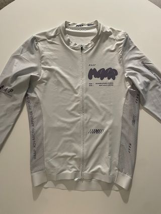 Maillot de ciclismo MAAP de manga larga, talla L, con un diseño moderno y detalles gráficos. - Color blanco y gris. - Logo MAAP en el pecho y mangas. - Tejido técnico para rendimiento. - Cremallera frontal completa.